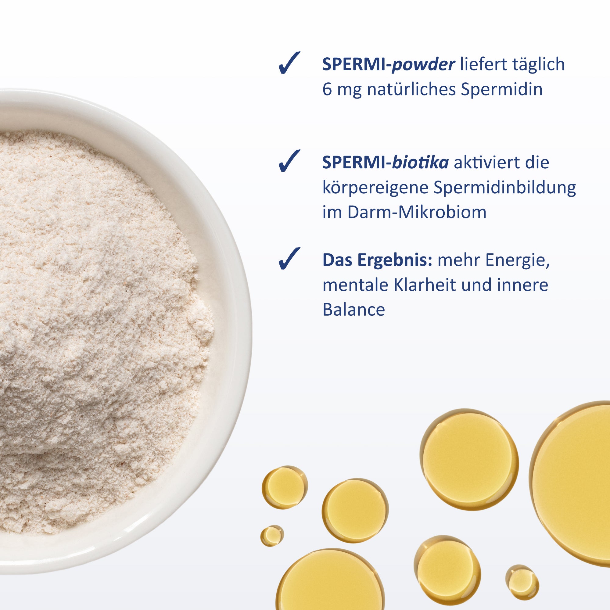 SPERMI-powder liefert täglich 6 mg natürliches Spermidin aus unserem 100 % naturbelassenen Weizenkeim-Direktkonzentrat und enthält zudem natürlicherweise wertvolle pflanzliche Vitamine und Mineralstoffe.