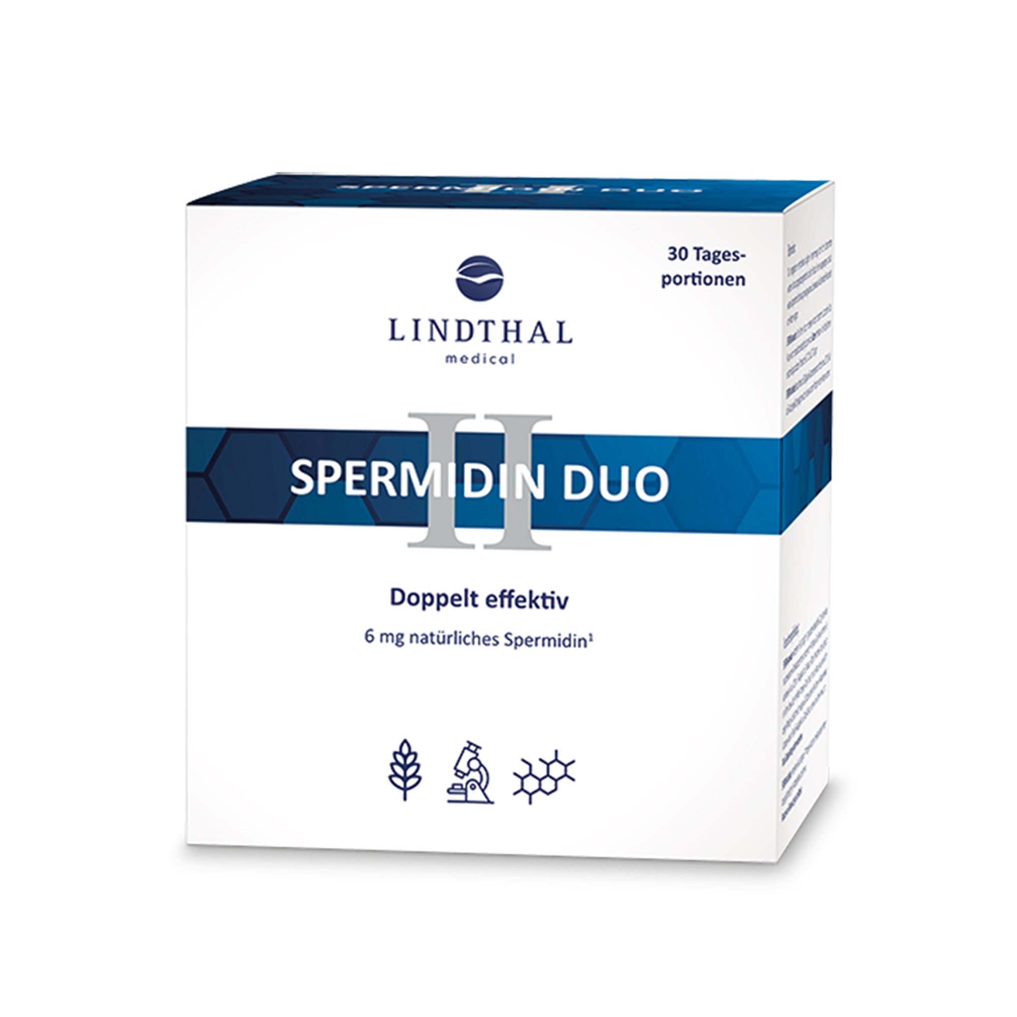 SPERMIDIN DUO liefert 6 mg Spermidin plus Bifidobacterium animalis subsp. lactis. Dieses 2-Komponenten-Präparat wird für 30 Tage eingenommen und unterstützt die optimale Supplementierung.
